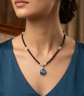 Sacred Tulasi Kanthmala with Labradorite Pendant, Handcrafted 925 Silver Spiritual Necklace