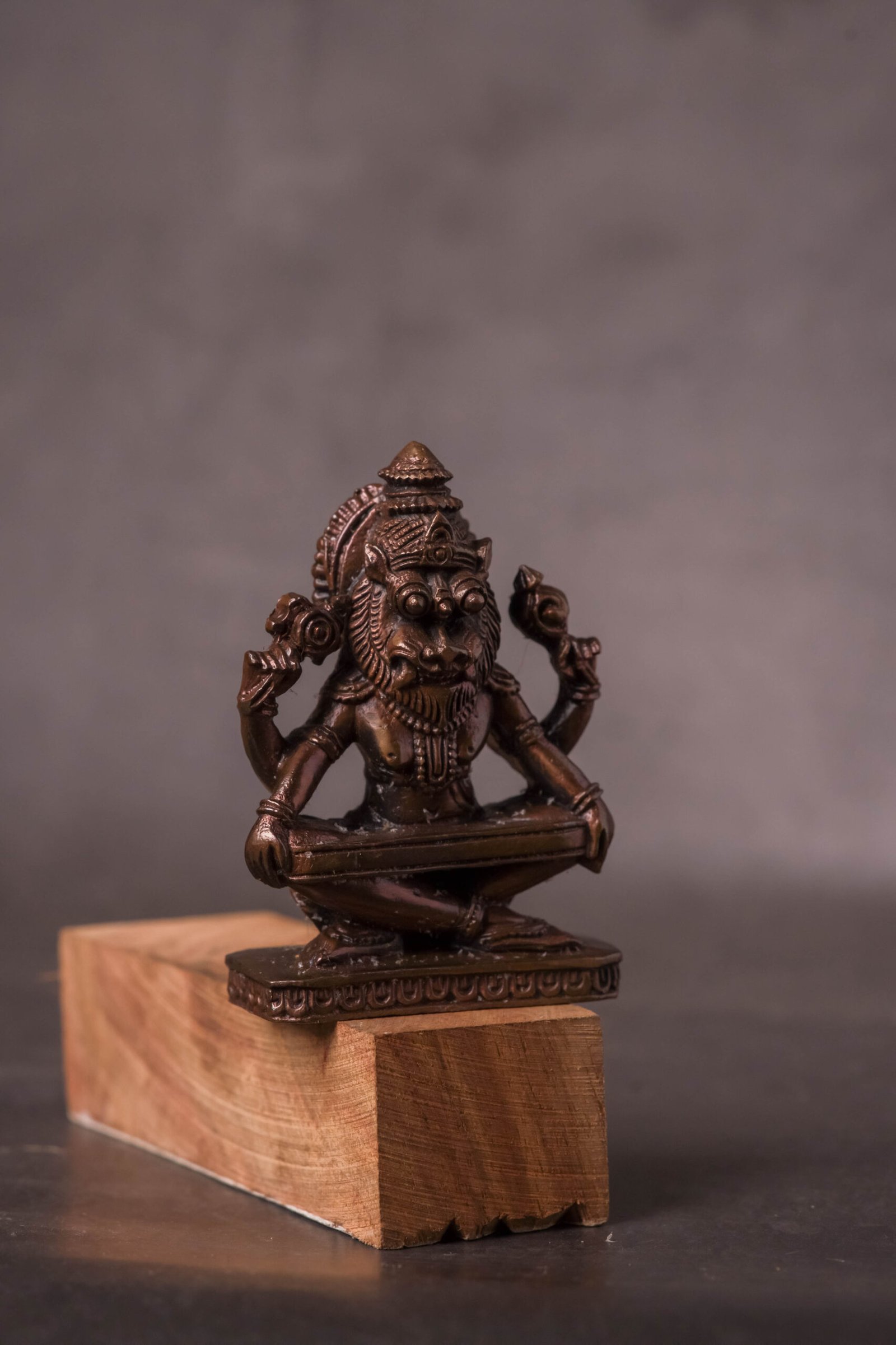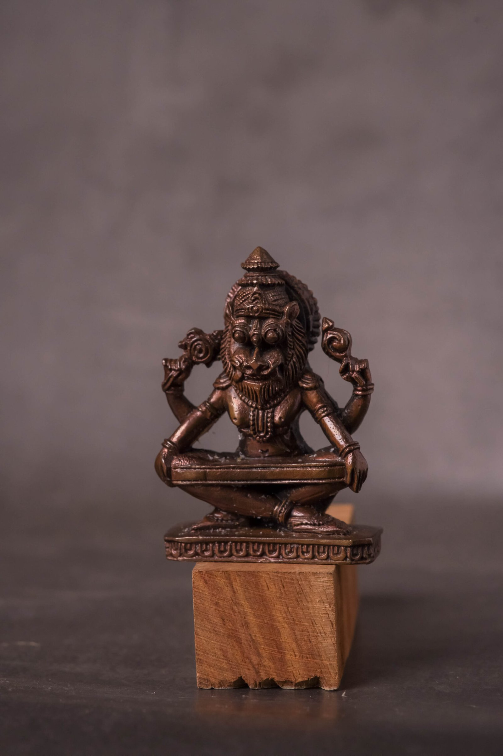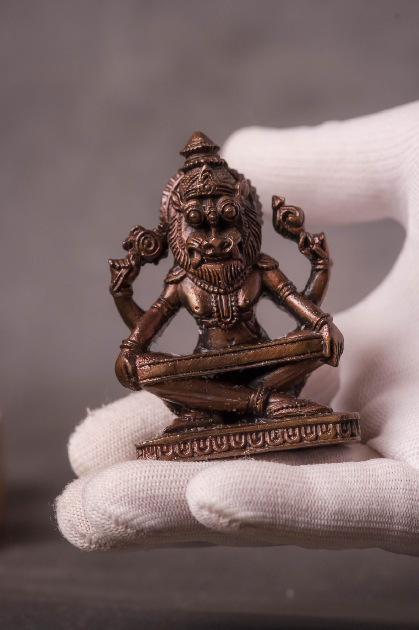 A 2.8-inch Copper Murti of Yoga Nrisimhadev is a unique and spiritually significant deity idol, perfect for a personal altar, small puja space, or as a traveling deity. This specific form of Lord Nrisimha is particularly revered for its tranquil and meditative aspect.
