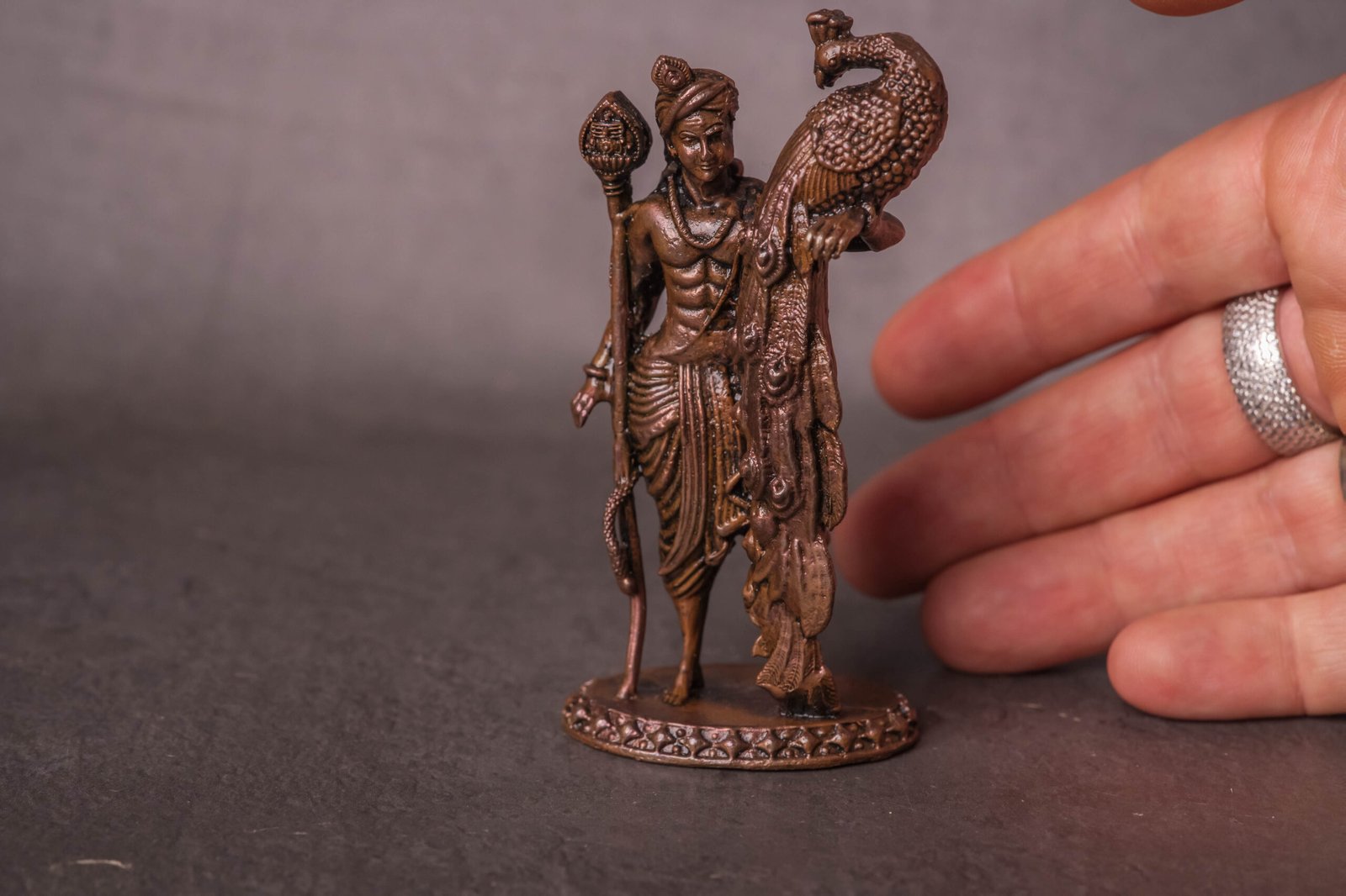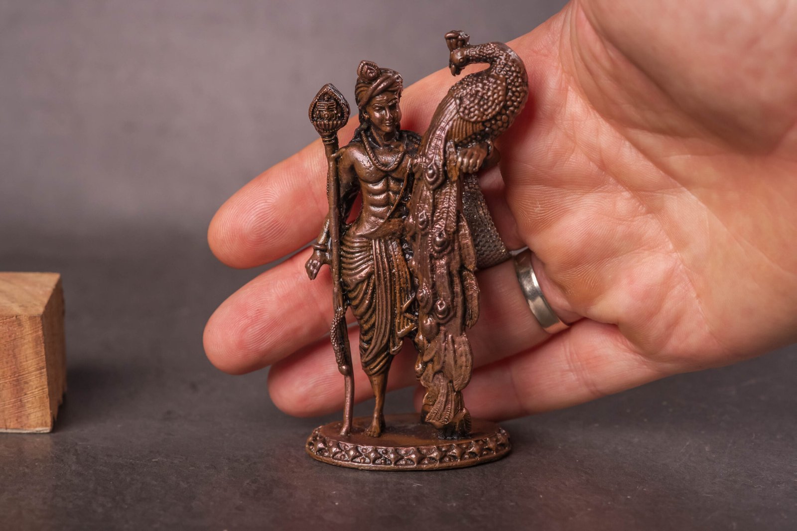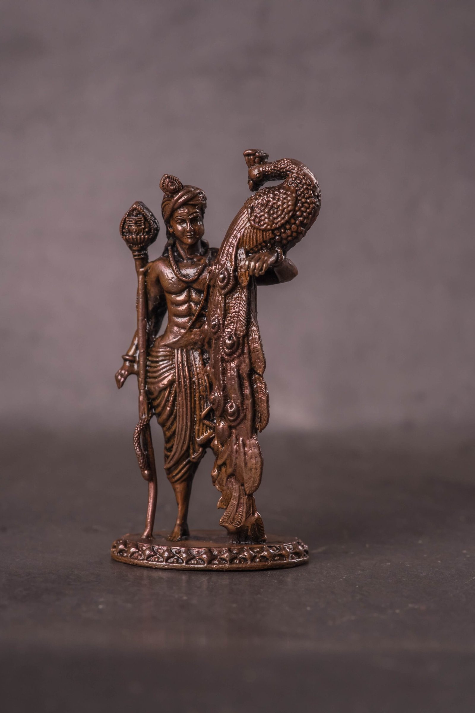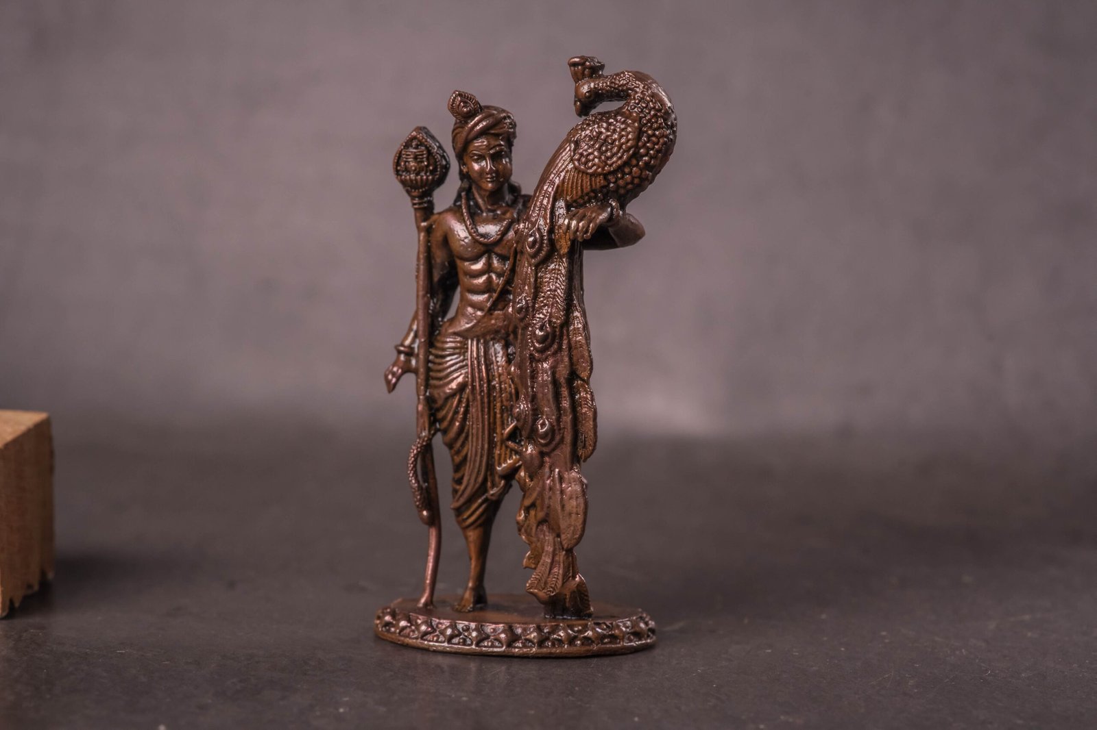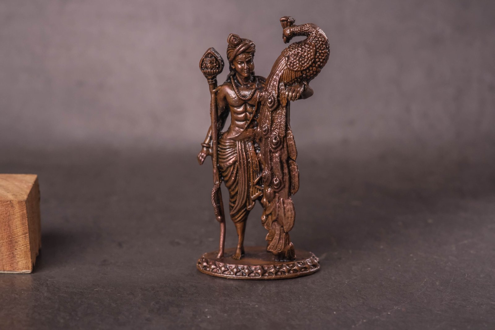 Beautiful 3.5-inch solid copper Murugan statue, featuring Lord Kartikeya standing gracefully beside His divine peacock.