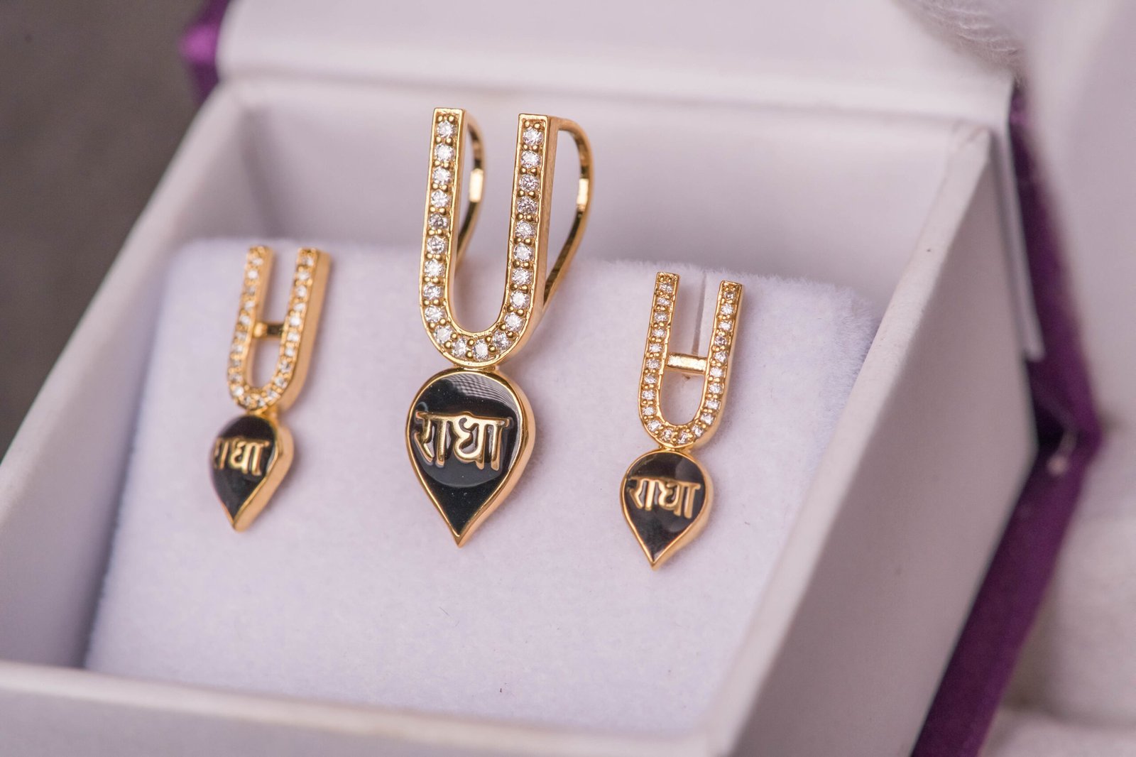 Vaishnava Tilak (Urdhva Puṇḍra Tilak): The core design remains the two vertical lines (representing Krishna’s lotus feet) with a central mark (representing Radharani or a Tulasi leaf). This symbolizes devotion to Lord Krishna.
