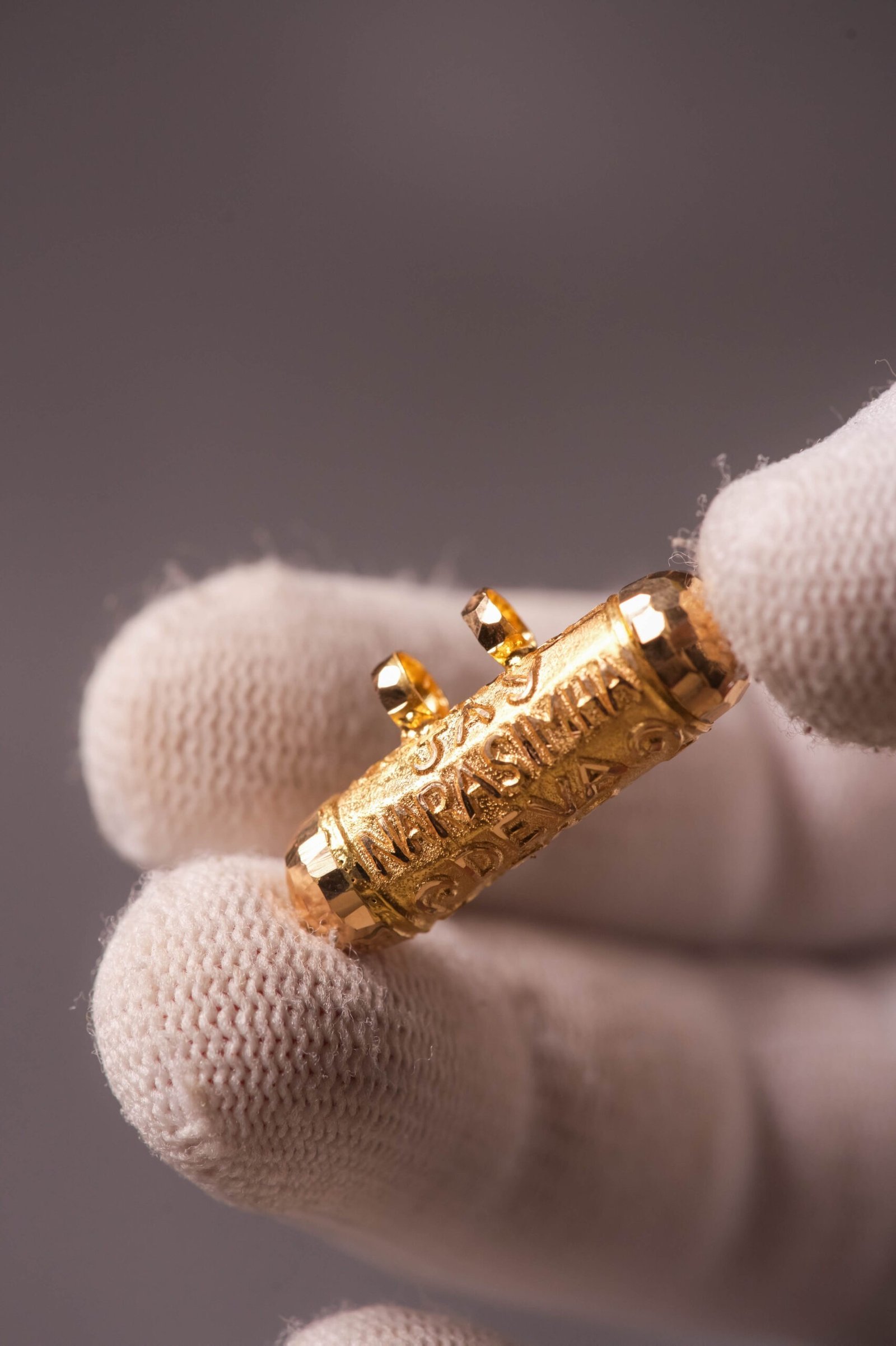 Crafted from genuine 18-karat gold, this Kavacha boasts a high purity level of 75% pure gold. Gold is considered the most sacred and purifying metal in Vedic traditions, symbolizing prosperity, spiritual wisdom, and divine light. Its radiant glow enhances the auspiciousness of the Kavacha.