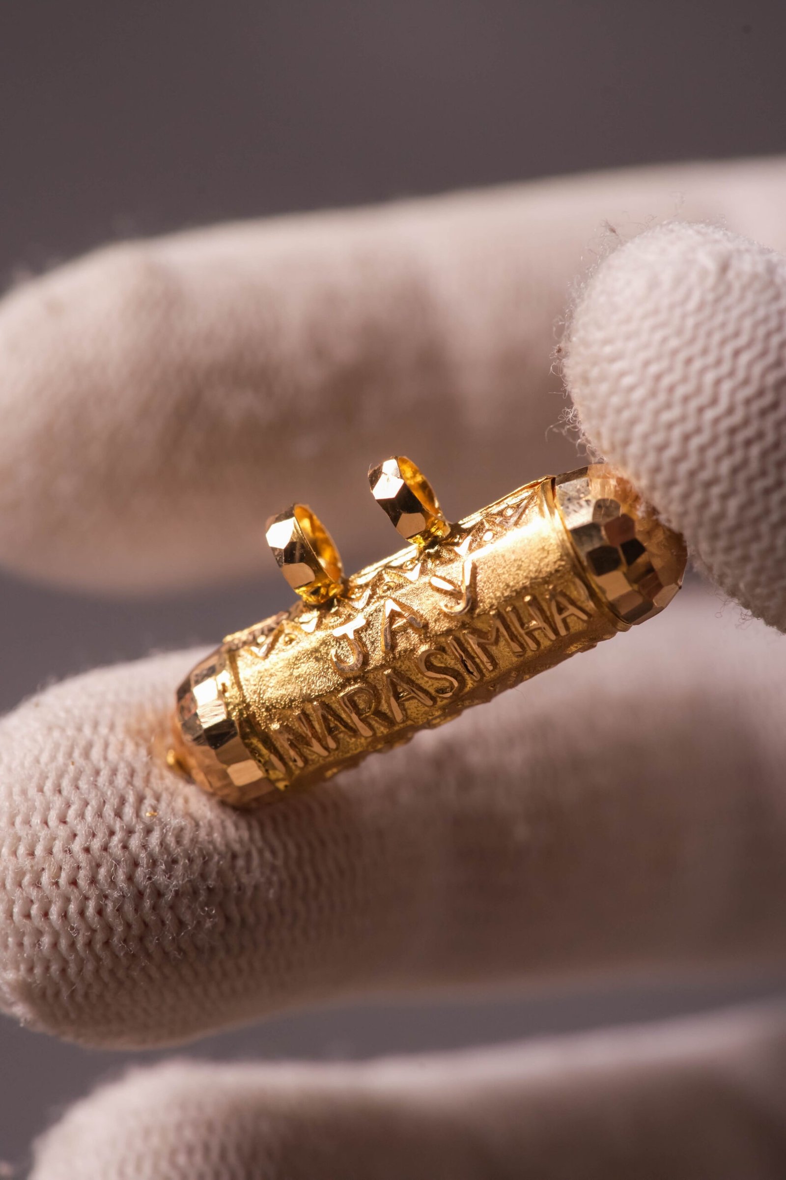 Wear the ultimate shield of divine protection with this exquisite 1.5-inch Nrisimhadev Kavacha, crafted from pure 18-karat gold. Meticulously handmade by our devoted family in the sacred Dham of Sri Mayapur, this powerful amulet invokes the fierce yet loving presence of Lord Nrisimhadev, offering unparalleled security and peace of mind to the sincere devotee.
