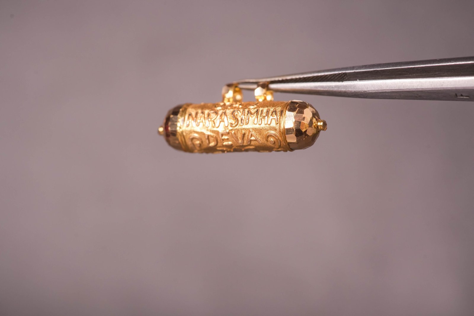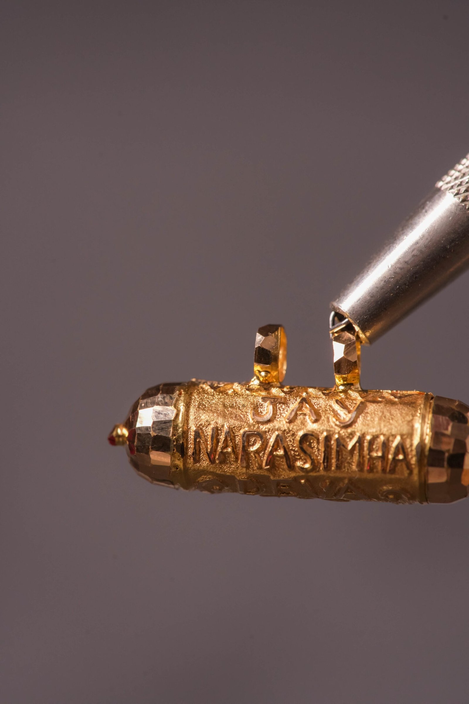 At a compact 1.5 inches (1.8 grams) this Nrisimhadev Kavacha is ideally sized for daily wear. It’s discreet enough to be worn under clothing yet significant enough to feel its powerful presence. It can be easily attached to a gold chain, sacred thread, or even a Tulasi mala.